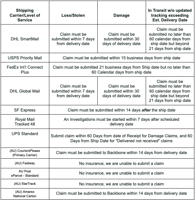 Si votre commande arrive endommagée, veuillez nous envoyer un e-mail dès que possible ici avec votre numéro de commande et une photo de l'état de l'article. Nous traitons ces questions au cas par cas et suivons les instructions du transporteur pour soumettre une demande d'indemnisation. Toutefois, nous ferons de notre mieux pour trouver une solution satisfaisante. Veuillez noter ci-dessous les délais pour chaque type de demande.